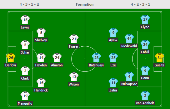- Newcastle (4-4-2): Darlow; Manuqillo, Fabian Schar, Lascelles, Lewis; Saint-Maximin, Shelvey, Hayden, Hendrick; Fraser, Callum Wilson.