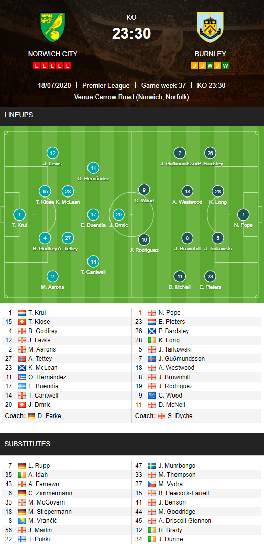 AEGoal.net cập nhật chính xác ĐỘI HÌNH RA SÂN trận Norwich vs Burnley diễn ra lúc 23h30 ngày 18/07 trong khuôn khổ vòng 37 - Ngoại hạng Anh.