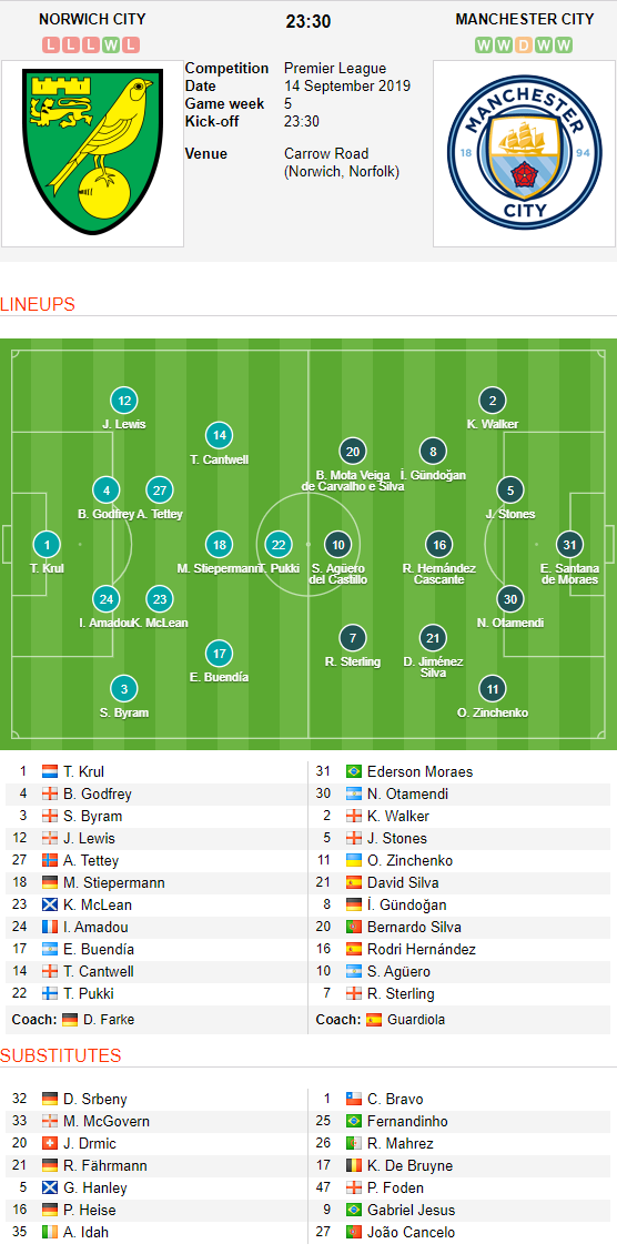 AEGoal.net cập nhật chính xác ĐỘI HÌNH RA SÂN Norwich vs Man City diễn ra lúc 23h30 ngày 14/9 trong khuôn khổ vòng 5 giải Ngoại hạng Anh.