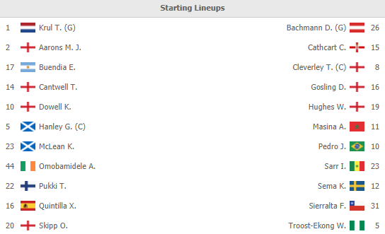 - Norwich: Zimmermann, Lukas Rupp, Adam Idah, Gibson, Byram, McGovern chấn thương; Giannoulis bị treo giò.