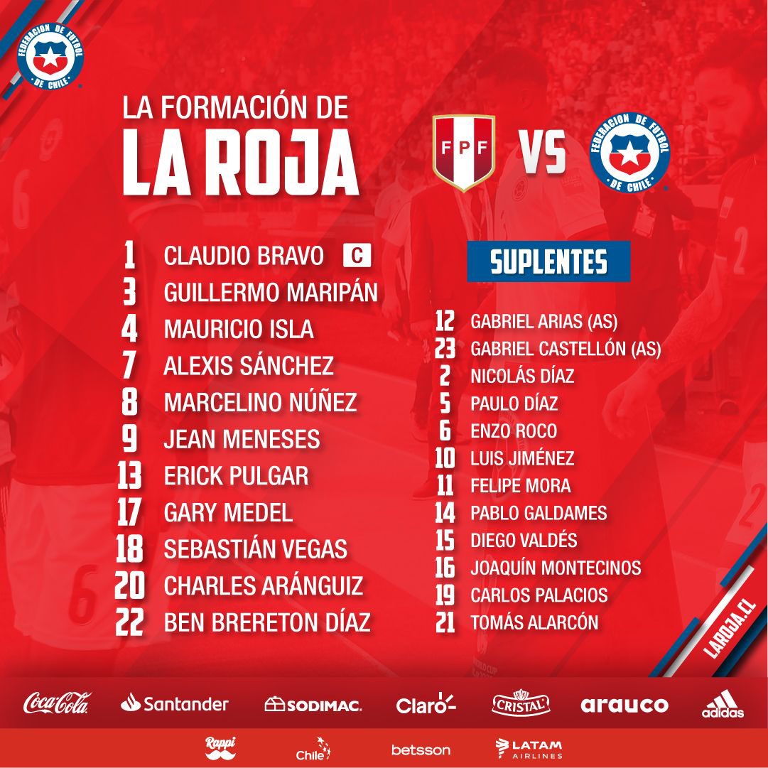 - Chile: Bravo; Diaz, Medel, Roco; Isla, Aranguiz, Vidal, Pulgar, Mena; Brereton Diaz, Sanchez.