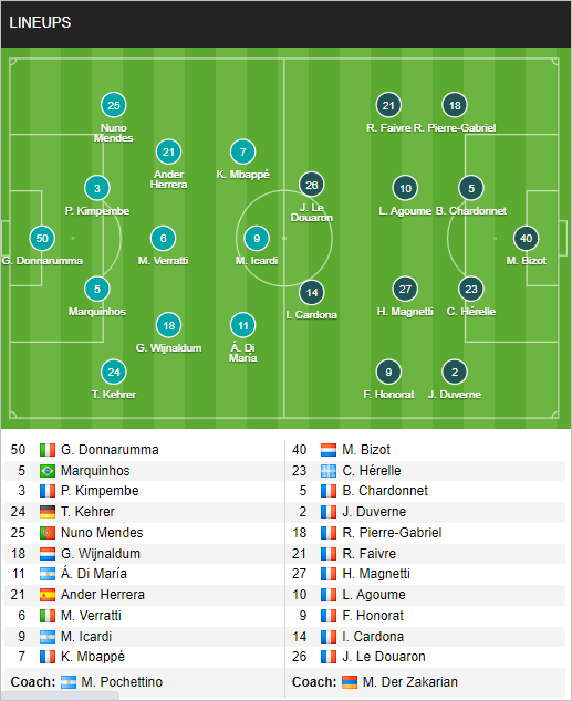 PSG: Neymar, Julian Draxler chấn thương. Juan Bernat, Nuno Mendes, Danilo Pereira, Layvin Kurzawa, Gianluigi Donnarumma, Lionel Messi chưa chắc ra sân. Abdou Diallo, Achraf Hakimi, Idrissa Gueye trở về tập trung ĐTQG.