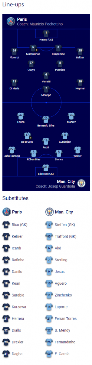 PSG (4-3-3): Navas; Kurzawa, Kimpembe, Marquinhos, Florenzi, Gueye, Paredes, Verratti, Di Maria, Neymar, Mbappe
