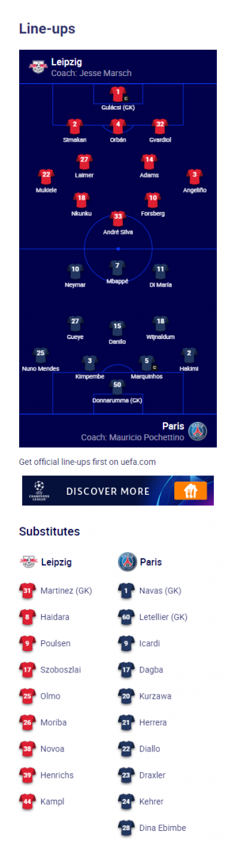 - PSG: Navas; Hakimi, Marquinhos, Kimpembe, Mendes; Herrera, Gueye, Wijnaldum; Di Maria, Mbappe, Neymar