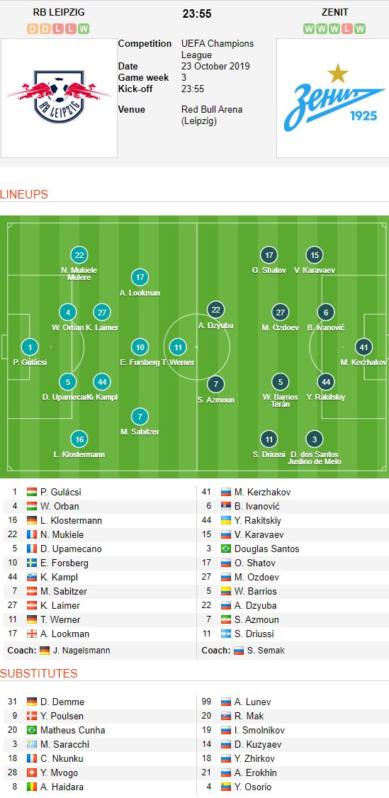 AEGoal.net cập nhật chính xác ĐỘI HÌNH RA SÂN trận RB Leipzig vs Zenit diễn ra lúc 23h55 ngày 23/10 trong khuôn khổ Bảng G - UEFA Champions League.