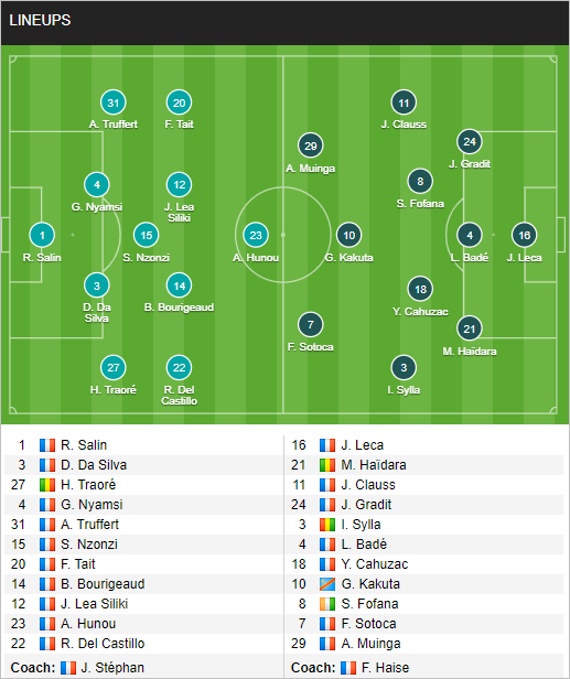 Lens: Leca; Fortes, Bade, Gradit; Clauss, Doucoure, Fofana, Sylla; Kakuta; Sotoca, Kalimuendo.