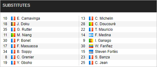 Rennes: Gomis; Traore, Da Silva, Nyamsi, Maouassa; Nzonzi; Doku, Camavinga, Bourigeaud, Gboho; Niang.