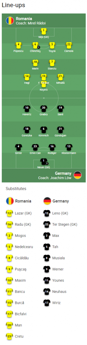 - Romania (4-3-3): Nita - Burca, Chiriches (c), Tosca, Bancu - Maxim, Cretu, Stanciu - Hagi, Keseru, Tanase