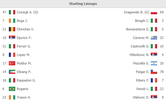 Sassuolo: Consigli; Muldur, Marlon, Ferrari, Kyriakopoulos; Locatelli, Obiang; Djuricic, Lopez, Boga; Raspadori