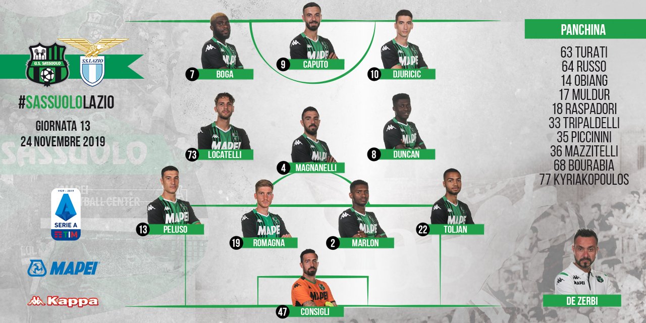 Sassuolo: Consigli; Toljan, Romagna, Marlon, Peluso; Locatelli, Magnanelli, Duncan; Djuricic, Caputo, Boga