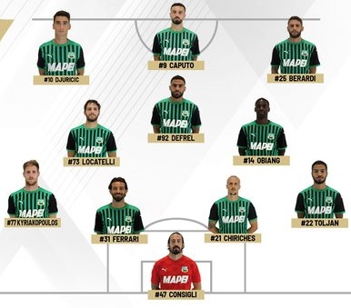 Sassuolo: Consigli; Toljan, Chiriches, Ferrari, Kyriakopoulos; Obiang, Locatelli; Berardi, Defrel, Djuricic; Caputo.
