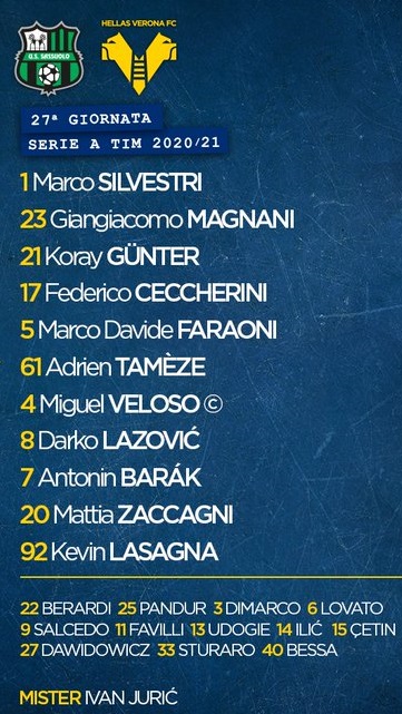 Verona: Silvestri; Magnani, Gunter, Ceccherini; Faraoni, Tameze, Veloso, Lazovic; Barak, Zaccagni; Lasagna.