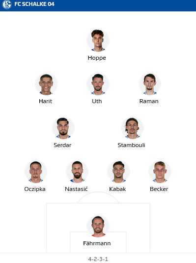 Schalke: Fahrmann - Becker, Kabak, Nastasic, Oczipka - Stambouli, Serdar - Raman, Uth, Harit - Hoppe.