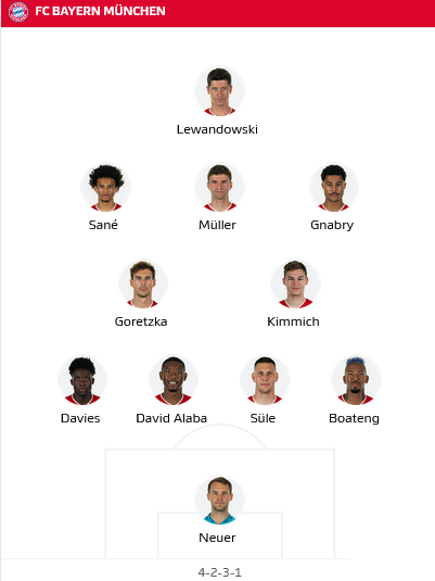 Bayern: Neuer (c) - Süle, Boateng, Alaba, Davies - Kimmich, Goretzka - Gnabry, Müller, Sane - Lewandowski.