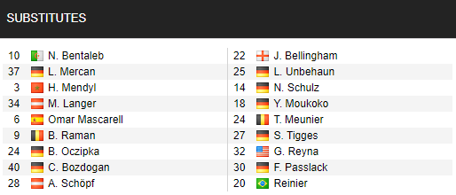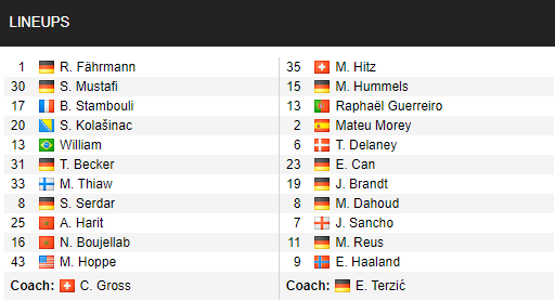- Dortmund: Vắng Lukasz Piszczek (chấn thương); Khả năng ra sân của Thomas Delaney, Roman Burki và Thorgan Hazard còn bỏ ngỏ.
