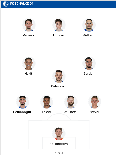 Schalke: Rönnow - Becker, Mustafi, Thiaw, Calahanoglu - Serdar, Kolasinac (c) - William, Harit, Raman - Hoppe