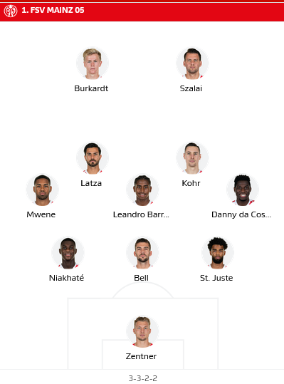 Mainz: Zentner - St. Juste, Bell, Niakhate - da Costa, Kohr, Barreiro, Mwene - Latza (c) - Burkhardt, Szalai