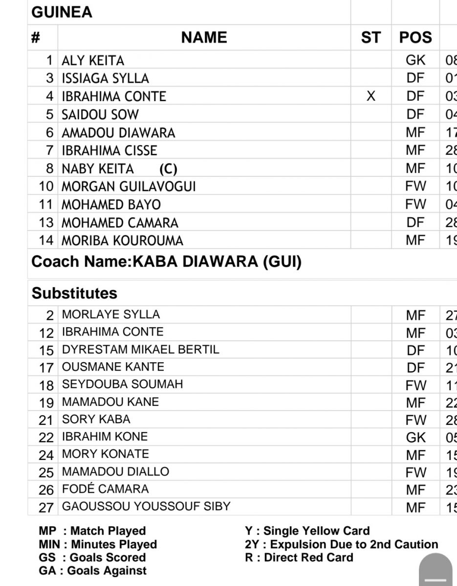 Guinea (4-3-1-2): Aly Keita; Mamadou Kane, Mohamed Camara, Saidou Sow, Ibrahima Conte, Issiaga Sylla; Amadou Diawara, Naby Keita, Aguibou Camara; Mohamed Bayo, Jose Kante