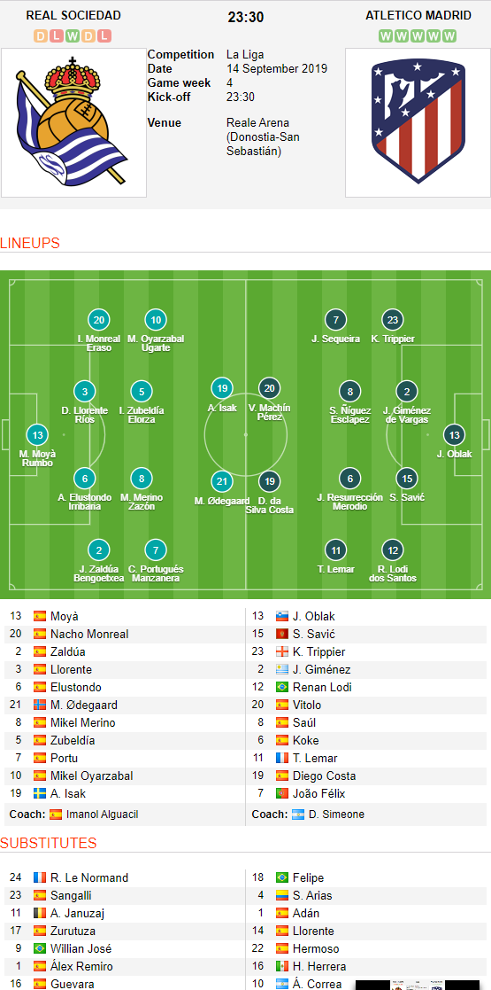 AEGoal.net cập nhật chính xác ĐỘI HÌNH RA SÂN Sociedad vs Atletico Madrid diễn ra lúc 23h30 ngày 14/9 trong khuôn khổ vòng 4 giải VĐQG Tây Ban Nha.