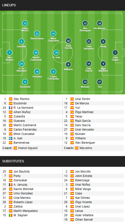 ĐỘI HÌNH RA SÂN trận Sociedad vs Bilbao, 02h00 ngày 08/04: VĐQG Tây Ban Nha