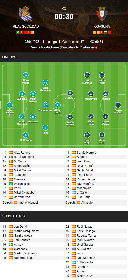 AEGoal cập nhật chính xác ĐỘI HÌNH RA SÂN trận Sociedad vs Osasuna diễn ra lúc 00h30 ngày 04/01 trong khuôn khổ Vòng 17 - VĐQG Tây Ban Nha.