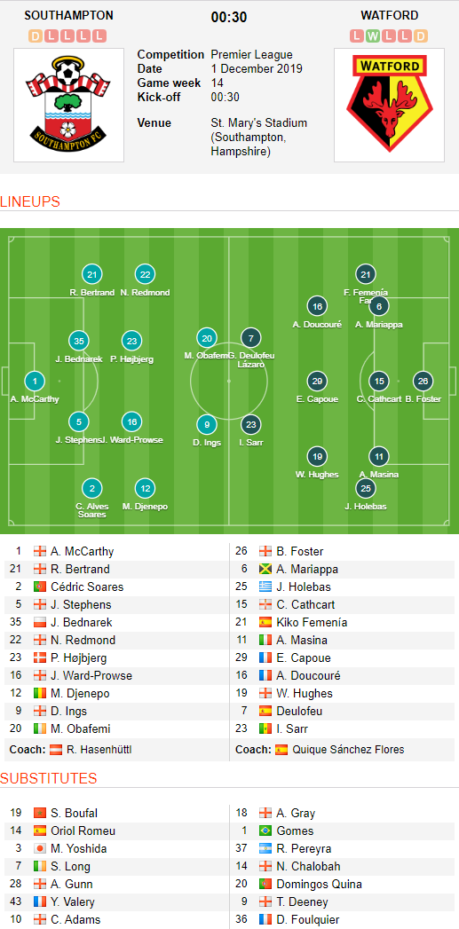 AEGoal.net cập nhật chính xác ĐỘI HÌNH RA SÂN trận Southampton vs Watford diễn ra lúc 00h30 ngày 01/12 trong khuôn khổ Vòng 14 - Ngoại hạng Anh.