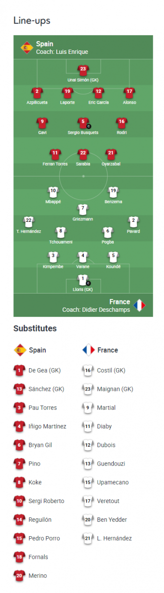 Tây Ban Nha: Simon; Azpilicueta, Laporte, P. Torres, Alonso; Koke, Busquets, Gavi; Sarabia, Torres, Oyarzabal