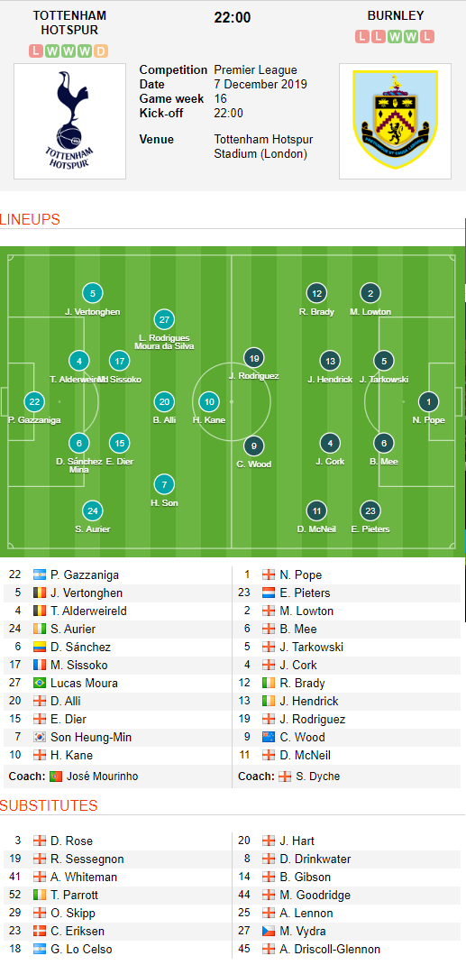 AEGoal.net cập nhật chính xác ĐỘI HÌNH RA SÂN trận Tottenham vs Burnley diễn ra lúc 22h00 ngày 07/12 trong khuôn khổ giải Ngoại hạng Anh.