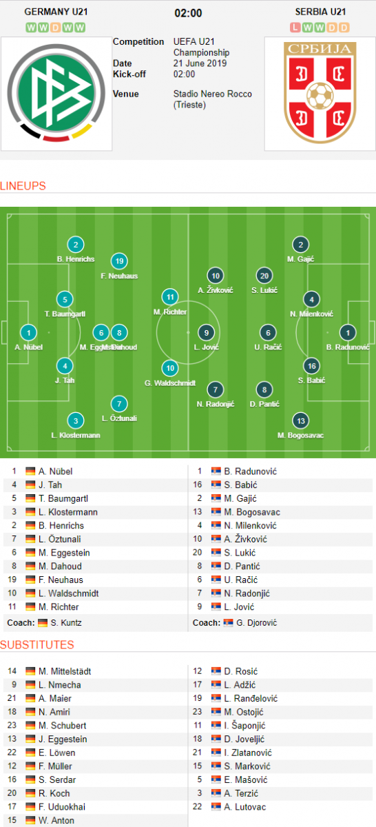 AEGoal.net cập nhật chính xác ĐỘI HÌNH RA SÂN trận U21 Đức vs U21 Serbia diễn ra lúc 02h00 ngày 21/6 trong khuôn khổ Bảng B - U21 châu Âu