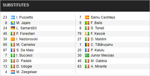 * Danh sách dự bị trận Udinese vs AC Milan, 02h45 ngày 12/12: VĐQG Italia