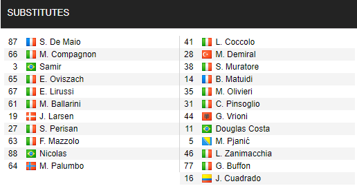 Udinese (3-5-2): Musso; Samir, De Maio, Nuytinck; Jens Larsen, De Paul, Fofana, Sema, Zeegelaar; Okaka, Lasagna.