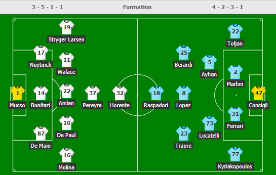 - Udinese: Pussetto, Forestieri, Jajalo, Deulofeu chấn thương