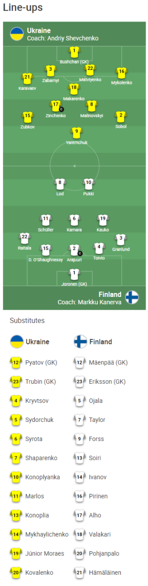 - Ukraine: Vắng Taras Stepanenko, Viktor Tsygankov, Artem Besedin (chấn thương), Ihor Kharatin và Viktor Korniienko còn bỏ ngỏ.
