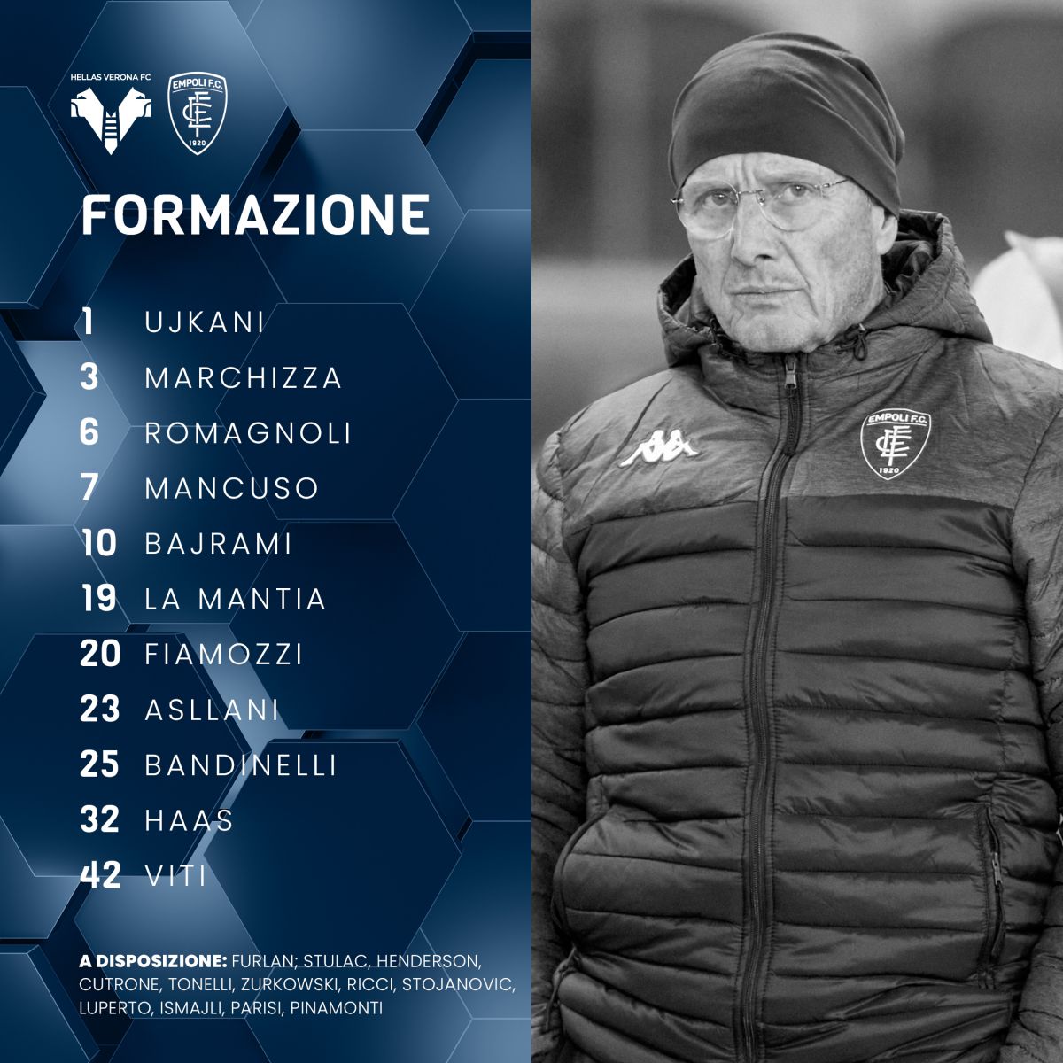 Empoli (4-3-1-2): Guglielmo Vicario; Fabiano Parisi, Sebastiano Luperto, Lorenzo Tonelli, Petar Stojanovic; Liam Henderson, Samuele Ricci, Szymon Żurkowski; Nedim Bajrami; Patrick Cutrone, Andrea Pinamonti