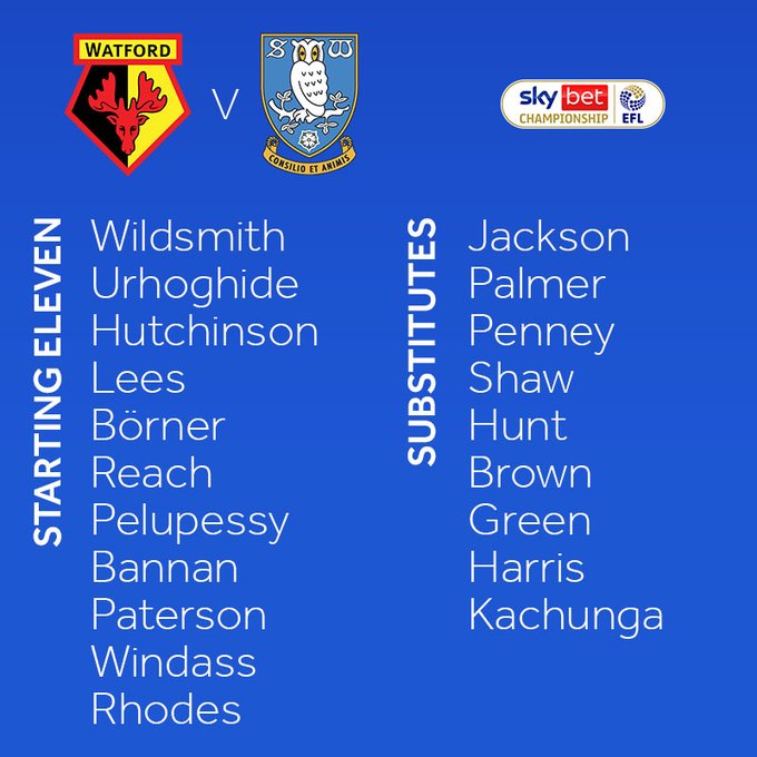 Sheffield Wed (3-4-2-1): Keiren Westwood; Tom Lees, Sam Hutchinson, Osaze Urhoghide; Kadeem Harris, Barry Bannan, Joey Pelupessy, Liam Palmer; Josh Windass, Adam Reach; Jordan Rhodes.