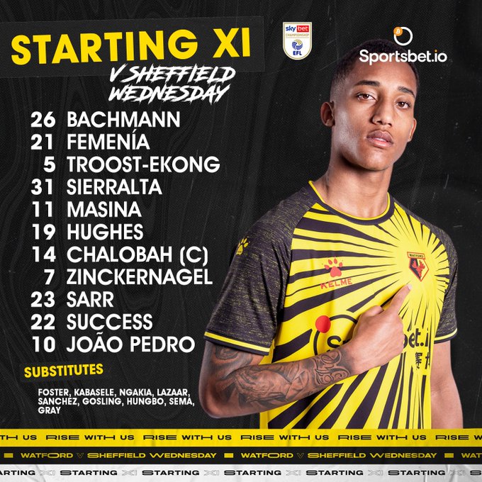Watford (4-4-2): Daniel Bachmann; Kiko Femenia, William Troost-Ekong, Francisco Sierralta, Adam Masina; Ismaila Sarr, Will Hughes, Nathaniel Chalobah, Ken Sema; Andre Gray, Joao Pedro.