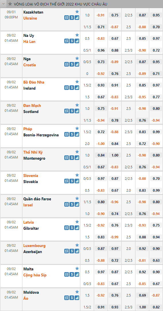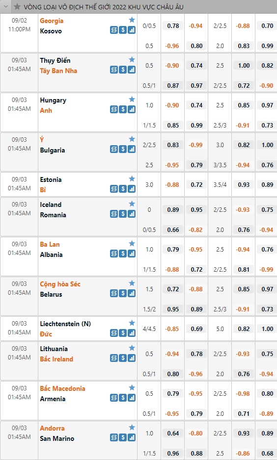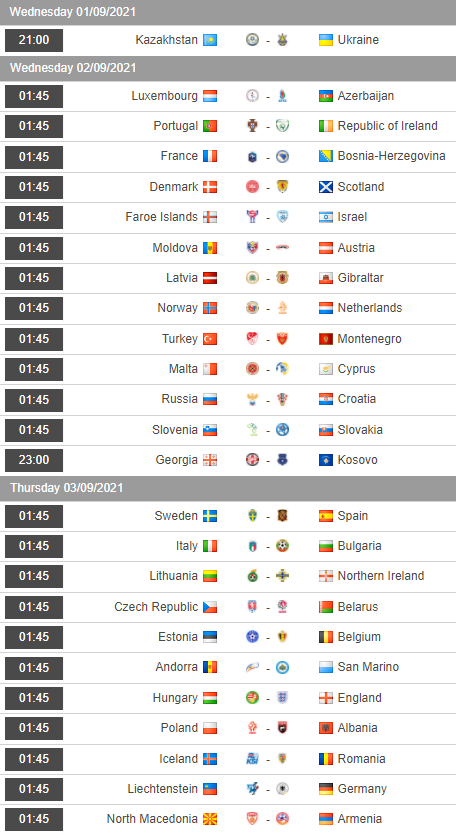Trong đợt tập trung đội tuyển lần này. Các đội tuyển khu vực châu Âu sẽ thi đấu 3 lượt trận tại của giai đoạn 1 vòng loại WC 2022 khu vực châu Âu. Không có nhiều bất ngờ sau 3 lượt đấu đầu tiên. Nhưng đội bóng được đánh giá cao tại các bảng đều giành được những vị trí thuận lợi. Sau đây là lịch thi đấu và tỷ lệ châu Á của lượt đấu thứ 4 giai đoạn 1 vòng loại WC 2022 khu vực châu Âu