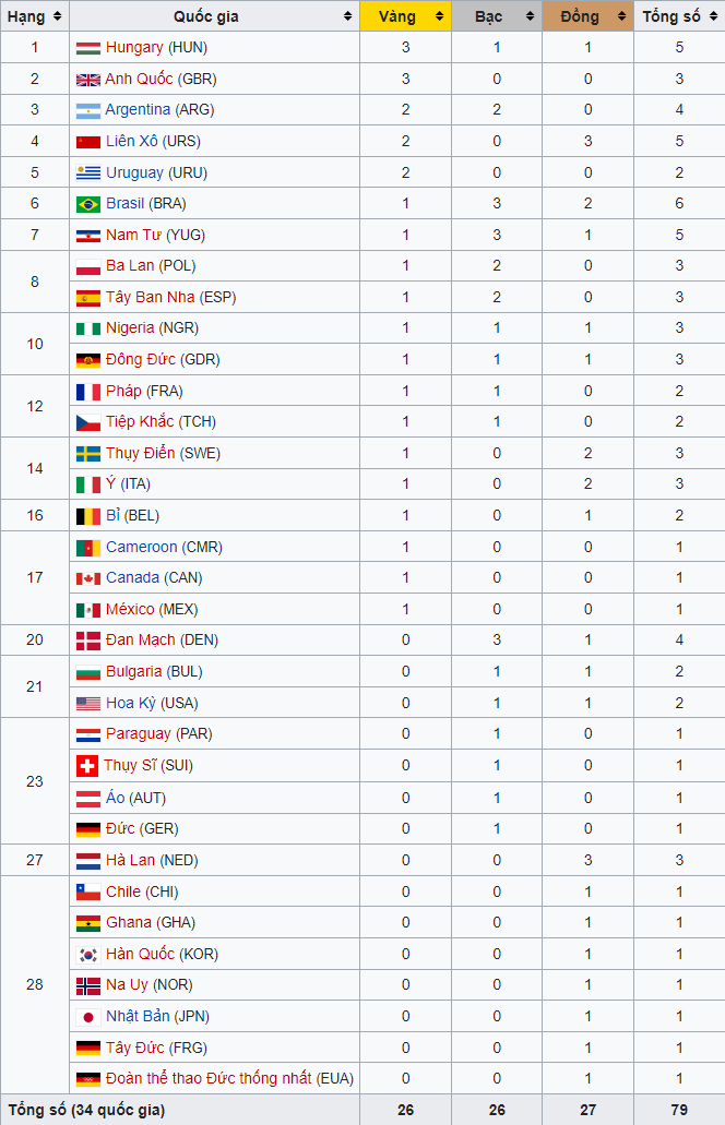 Có thể thấy Châu Âu vẫn hoàn toàn chiếm ưu thế tại Olymic với 17 chiến HCV, hai đại diện có nhiều HCV nhất đều thuộc châu Âu là Vương Quốc Anh và Hungary với 3 HCV. Các đại diễn Nam Mỹ cũng đã giành tổng cộng 5 HCV, Argentina và Uruguay mỗi quốc gia 2 lần và lần còn lại thuộc về Brazil. Bắc Mỹ cũng có 2 đại diện là Canada năm 1904 và Mexico (2012). Các đại diện châu phi cũng đã có 2 chiến HCV liên tiếp vào các năm 1996 và 2000 thuộc về Nigeria và Cameroon.