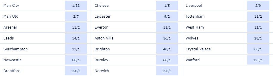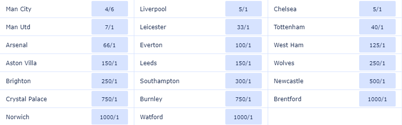Cụ thể như nhà cái William Hill đã xếp họ cùng Liverpool ở vị trí thứ 2 cho khả năng vô địch tại Premier League mùa này với tỷ lệ đặt 1 ăn 5 chỉ thấp hơn Man City với tỷ lệ đặt 6 ăn 4. Trong khi với tỷ lệ cược đội kết thúc giải với vị trí trong top 4, Chelsea cũng được đánh giá rất cao với tỷ lệ đặt 5 ăn 1.