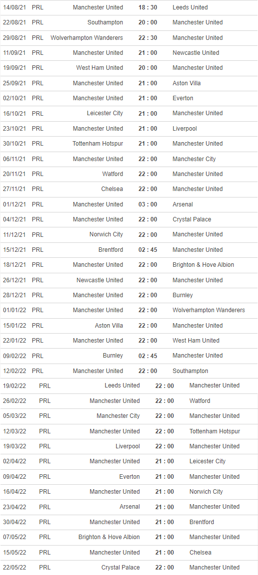 Lịch thi đấu giải Ngoại hạng Anh mùa giải 2021/2022 của Man Utd