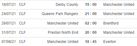 Manchester United đã xác nhận lịch thi đấu chuẩn bị trước mùa giải này, qua đó Quỷ đỏ sẽ thi đấu 5 trận đấu giao hữu với các câu lạc bộ đang thi đấu cho giải hạng nhất Anh và giải Ngoại hạng Anh. Như vậy 5 trận đấu này đều được tổ chức tại vương quốc Anh.