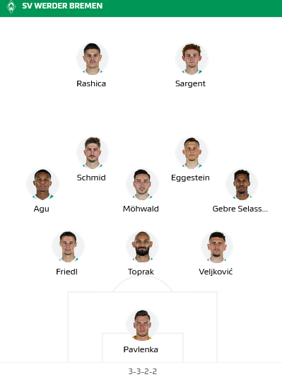 Bremen: Pavlenka - Veljkovic, Toprak, Friedl - Gebre Selassie (c), Eggestein, Möhwald, Agu - Schmid, Rashica - Sargent.