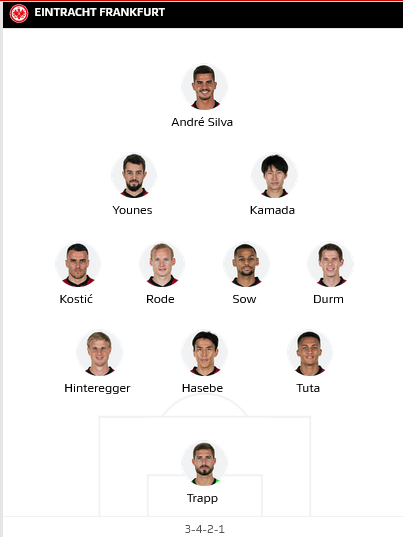 Eintracht Frankfurt (3-4-2-1): Trapp; Tuta, Hinteregger, Rode; Barkok, Djibril Sow, Hasebe, Kostic; Kamada, Amin Younes; Andre Silva.