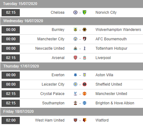 Ở bảng xếp hạng giải Ngoại hạng Anh hiện tại Liverpool đã vô địch, Norwich cũng đã chắc suất xuống hạng. Các đội đang trong nhóm xuống hạng như Bournemouth, Aston Villa đều còn cơ hội trụ hạng. Ở nhóm trên của BXH vị trí tham dự Champions League mùa tới vẫn có sự cạnh tranh quyết liệt của Leicester City, Chelsea và Man Utd. Các đội Wolves và Sheffield Utd trên lý thuyết vẫn còn khả năng cạnh tranh nhưng không có nhiều hy vọng.