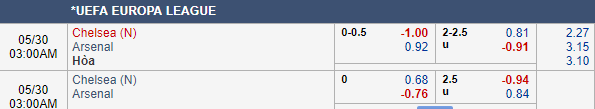 AEGoal cập nhật và đưa ra đánh giá về tỷ lệ châu Á trận chung kết Europa League giữa Chelsea vs Arsenal.